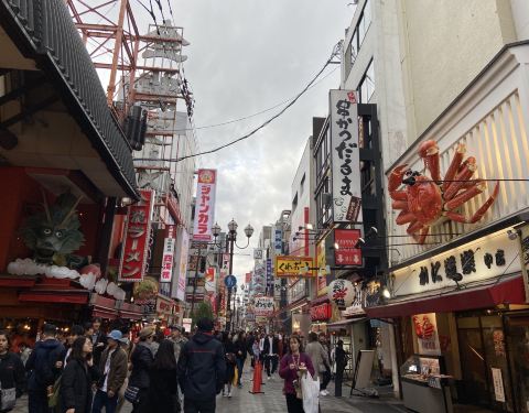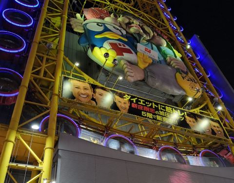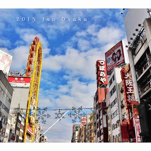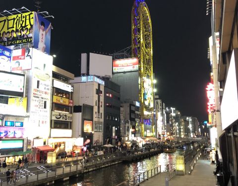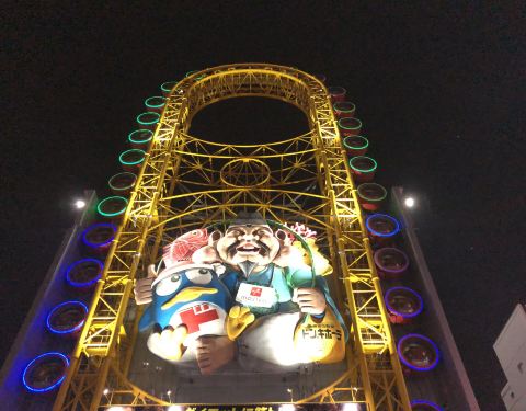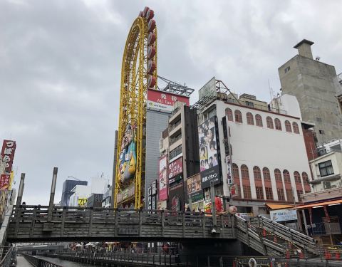 在道顿堀逛有名药妆店唐吉诃德,同时可以乘坐有财神爷的摩天轮。