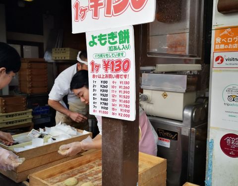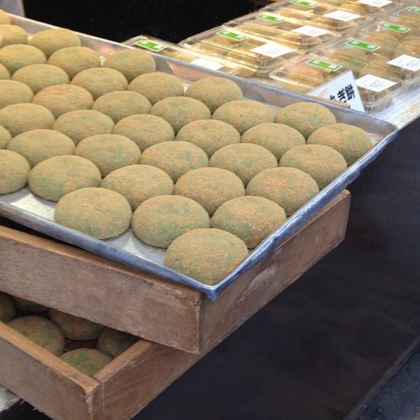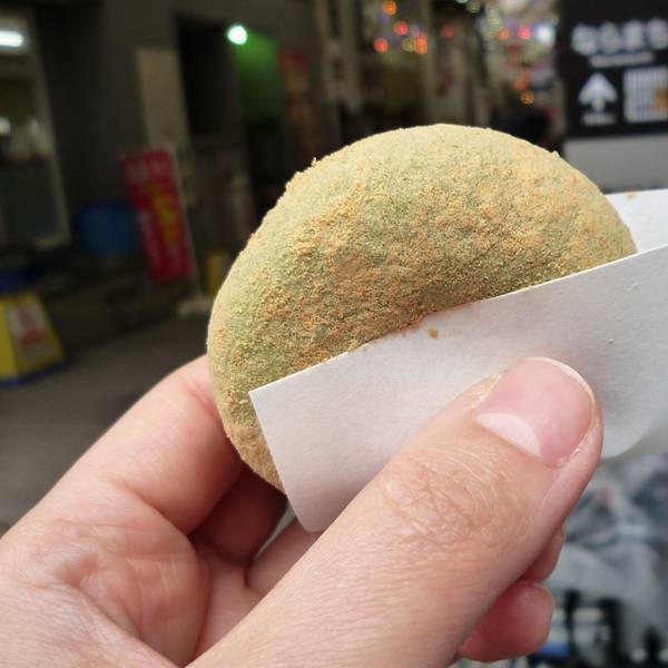 从奈良JR站往奈良公园的步行街上,一定不会错过这家店,门口持续排队的长龙一定需要你绕道而行,这里离近铁站出口非常近,几乎所有游客都人手一个草饼,虽然队伍长,但排起来非常快,几乎翻个钱包找个零钱的功夫就轮到了,现做现吃的草饼很是软糯香甜,艾草的气味和黄豆粉融合的刚刚好,红豆沙甜度适中,个头足,算是物美价廉的佳品小吃。
