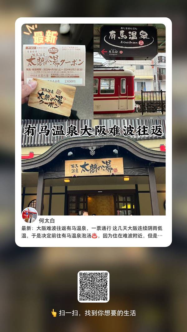从阪急乘大巴直达有马温泉小镇大约一小时15分钟左右,干净的小镇质朴热情的小镇居民給我留下深刻的...从阪急乘大巴直达有马温泉小镇大约一小时15分钟左右,干净的小镇质朴热情的小镇居民給我留下深刻的印象,温泉有金汤银汤之分,还有免费的足浴,最著名的还有一家米其林餐厅,但要排队哦!