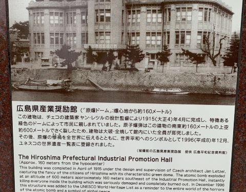 原子弹爆炸圆顶屋,又名广岛和平纪念碑,原本是广岛县产业奖励馆,位于广岛市中心的元安川的河畔。1945年8月6日,美军以原子弹轰炸广岛,爆炸中心附近的建筑物几乎全数被夷为平地,仅此屋勉强屹立没有倾倒。如今这座建筑遗址被作为这一事件的纪念物而保存,并被列入了世界文化遗产名录。 在这附近常能碰到原子弹辐射受害者的家属,他们会热心地向外国游客用英文诉说原子弹爆炸的经由及其家庭的故事。这里也是当地中小学生经常参观的地方,而日本各界的和平团体每年都会在这里举行纪念活动。 广岛市政府在原子弹爆炸圆顶屋周围修建了一座广岛和平纪念公园,公园中除了众多的塑像与纪念碑外,还建有广岛和平纪念资料馆,展示着经历过原爆的衣物、眼镜、头发等物品,值得参观一下。 每年8月6日,当地人会在元安川的河面上举行放河灯活动,将写有悼词和祈愿的各色灯笼放流河中。