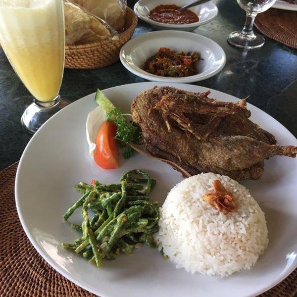 - 这家著名的网红餐馆环境优美,人气超旺,服务也很不错,。脏鸭餐是非常富有印尼风味和当地特色的一道料理