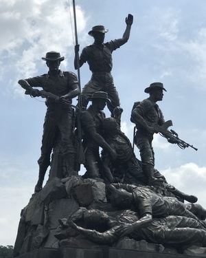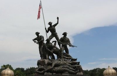 国家英雄纪念碑位于吉隆坡市中心,在湖滨公园对面,靠近吉隆坡火车总站和国家清真寺。建造于1966年,是为纪念为国牺牲的烈士而建的。从位于Persiaran Sultan Salahuddin路的入口进入,就可以看到高大的纪念碑。门前有一块石碑上刻有马来西亚的国徽。石碑被一汪清澈的水围绕着,碑下还有很多当地人敬献的红色小花环,错落有致的摆放着。碑身上刻着“1914-1918、1939-1945、1948-1960”的字样。1914-1918、1939-1945这两个时期分别是一、二次世界大战,1948-1960则是马来西亚的内战,在马来西亚历史上称之为“非常时期”。碑上铜铸的碑文是阵亡者的姓名,四面都不一样。石碑的前面是一个小型广场,你可以看到一座白色的清真寺造型的建筑。金色的圆顶尖上与清真寺的相同,也是月亮和星星。新月象征马来西亚的国教——伊斯兰教,14角星象征马来西亚的13个州和政府。圆顶建筑被围着,游客无法入内。圆顶建筑的后面就是一座喷泉,特别是就是水池里的锡花,是吉隆坡的特产。喷泉的前面就是七勇士青铜塑像。整座雕塑高15.54米,是世界上庞大的单体雕塑作品之一,由美国闻名雕塑家威尔顿设计,在意大利铸造。作品塑造了7位军人,象征着7种领导的素质,即领导能力、苦难的经历、团结、警觉、力量、勇气及牺牲。勇士的铜像昂然矗立于大理石上,非凡的气势传神地再现了他们生前的风采。