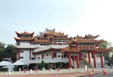 天后宫又名雪隆海南会馆,位于马来西亚吉隆坡乐圣岭(Robson Height),建于1989年,也是成立100周年时正式开幕与启用。常常租借场地及举办供各类深具华人文化的活动,同时也是为吉隆坡的主要建筑与旅游景点。 外表装饰华丽的天后宫紧邻赛布特拉路,周围比较偏僻,它的门前就有很多小型景观,比如小鹿造型的人造喷泉、12个雕塑以及用很多中国成语打造的彩灯雕塑等。入庙前可以先在这里拍照留念一下。 它的整体风格和中国的一些寺庙很像,红色、白色和金色成为了整个建筑的主色调,到处都是龙凤的雕塑。宫殿似的是一座4层楼高的庙宇,底层是精品摊位和食堂,1楼是礼堂,2楼是婚姻注册局和办事处,3楼是天后殿,暮色中传送沉沉鼓声的鼓亭则在高楼。 礼堂的左右侧都有可通往天后殿的楼梯,这竹形石梯是通往庙殿的途径。在未到达天后殿前,沿着楼梯向上走,“结婚注册局” 指示牌对着来客特别醒目,许多当地的新人都会选择这里注册结婚。在妈祖娘娘、亲友的见证下,一对对有情侣春风满脸地把名一签、交换了戒指后,就是合法夫妻了。 走上3楼时,景观又全然改变,视线变得辽阔了,你可以眺望远处的风景。整齐的红柱子一排一排地竖立,每一根柱子仿佛都在讲述着自己特别的故事,这些殷红的柱子雕上33位国内外名书法家的字迹,龙飞凤舞,就像武侠小说里英雄在墙上留字一样。如今,这些红柱上的金字也成为稀有的墨宝。