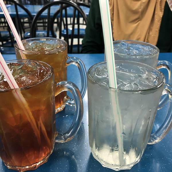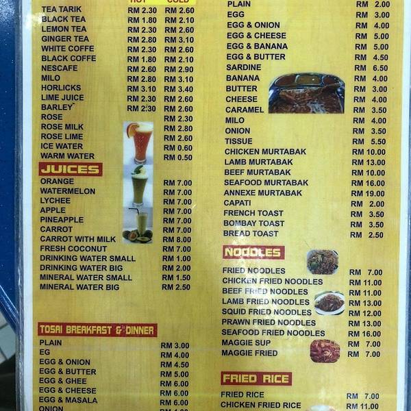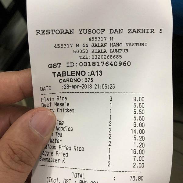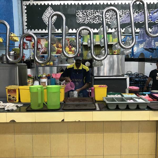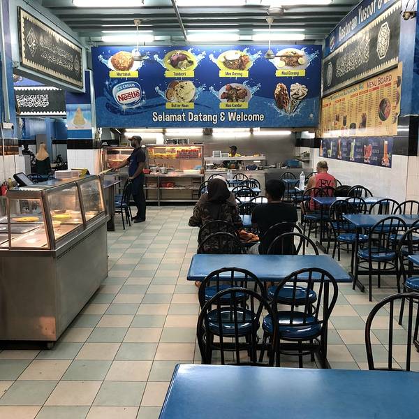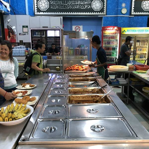 Restoran Yusoof dan Zakhir餐厅是一家位于吉隆坡市中心的特色餐厅,餐厅位于吉隆坡Central market大门口,乘坐吉隆坡purple line在Pasar Seni出站往茨厂街方向直走便可以看到位于路口的这家餐厅,吉隆坡市区除了夜市以外,一般餐厅打烊都比较早,我们抵达的时候大多数餐厅都已经关门了,只有这家还在营业,于是不由分说进门吃饭。这家餐厅面积比较大,有点类似于国内大排档的感觉,一个大厅里面摆放着20-30个桌子,然后坐定后会有工作人员到桌子跟前点餐,这里主营马来西亚当地特色,有各种汤面,炒面,咖喱米饭,炒米饭,海鲜锅,汤品以及各种饼,晚上还有一些BBQ的品种,可以说是各种系列都比较齐全。餐厅内,不同类型的食品有各自的窗口,可以看到有专门制作冷饮的台面,也有各种米饭套餐的自选区(类似于国内的盒饭,不过是根据你打的菜品计算价格的),店里还专门设有一个现做现卖的印度飞饼窗口,厨师花样表演式的制作各种饼,非常的惹人眼球。我们一行人点了马来西亚炒饭,特色炒面,香蕉飞饼,咖喱鸡腿饭,葱油饼,炒粉等,还有冰镇的柠檬红茶,一共消费77马币,约合不到人民币150元,还是很实惠的。不过,除了香蕉飞饼和咖喱鸡腿饭比较符合胃口外(跟国内的味道相似),其余的餐品都显得略有些咸(也许是加了酱的缘故),国人不一定能吃的惯。菜单是纯英文的,不过部分菜品配的有图,大概意思和价格也能看得懂,有点英文基础的应该不会觉得有难度。总的来说,这家餐厅位置很不错,性价比也比较高,还是值得品尝的。
