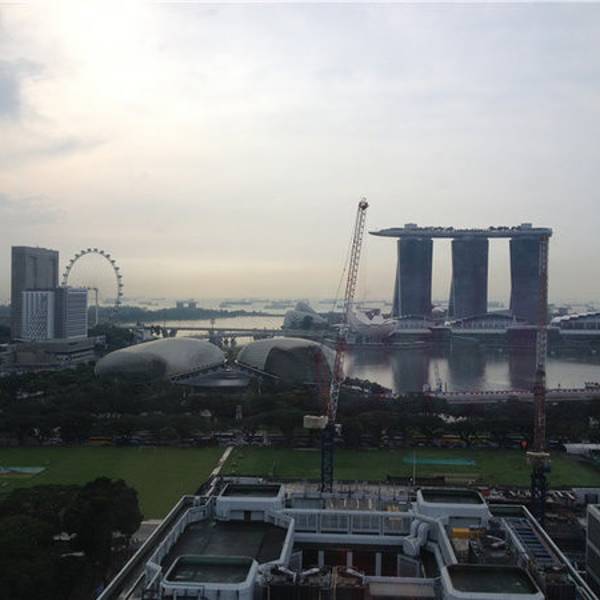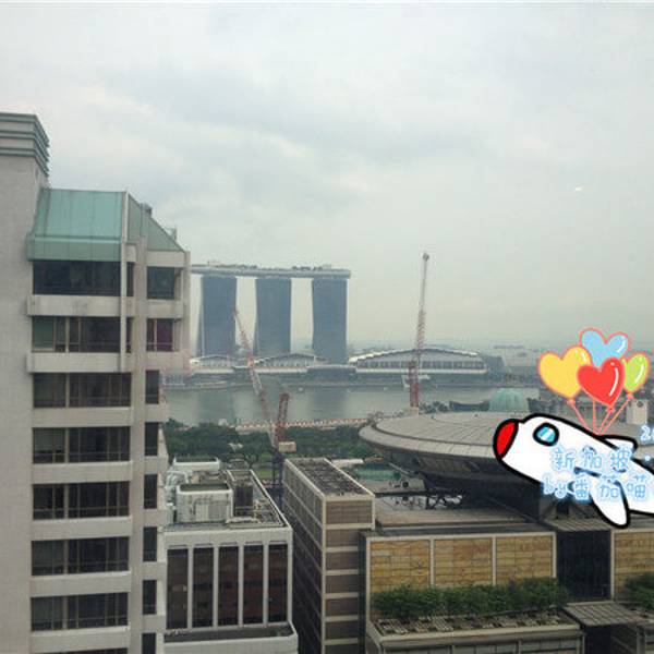 Agoda上订房间的时候是特惠,所以是不含早的,我们入住的时候另外加了一天的早餐先试一下,毕竟20新币/人吃个早餐。。还是老奢侈滴说。 酒店有两个餐厅可以吃早餐,一个就是我们房间看到的对面那幢楼的顶楼,有个Sky Lounge,风景比较好,无遮挡,但吃的东西是限定的不是自助。 我们决定上去看一眼,闺蜜去看了食物。。我就去窗边拍了几张照片。。摩天轮金沙 大榴莲 尽收眼底,无视突兀的脚手架煞风景了。。然后果断撤到楼下吃自助早餐去。。