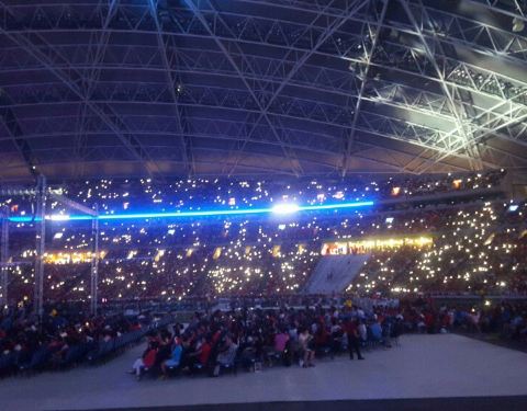 发现一个小正太。全场等JJ啊 出来的时候呼声很高。远望。准备入场不能带吃的 我忍痛丢了自己的棉花糖今天是新加坡五十周年音乐会,姐姐订了票,地点是stadium,坐地铁就到这里。演唱会还没开始,我在周围晃悠,发现了屋顶游泳池,很多孩子在玩。