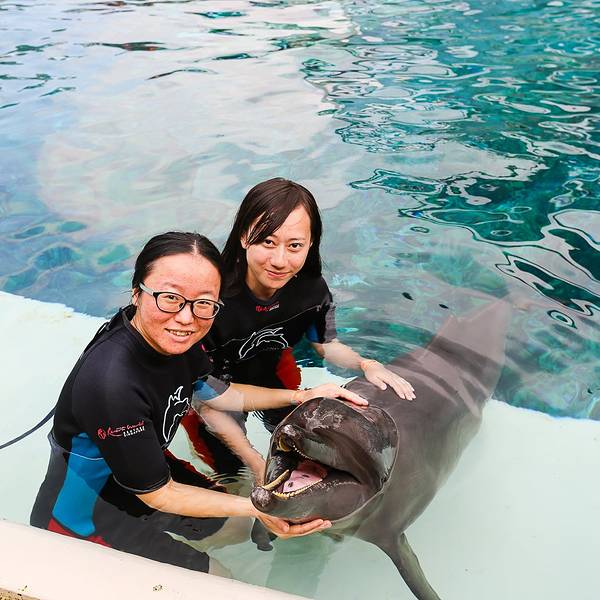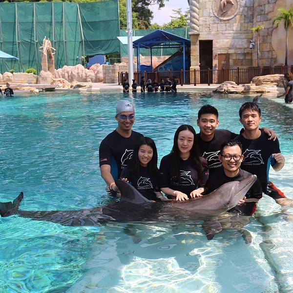 换上泳衣、穿上潜水服,跟着海豚培训员了解海豚的生活习性,理解海洋生物保育及保护的重要性。做好一切准备工作后,跟着幽默的培训员下水,跟海豚亲密互动。
