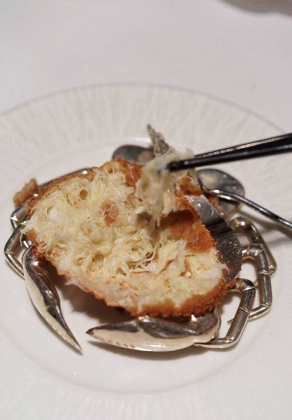 专门为这道菜订制的餐具也太精致了。一个蟹盖实实在在全是拆好的蟹肉一点点香甜的奶汁更衬托出蟹肉的鲜美。这个满足感很可以。