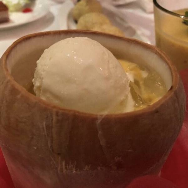 椰肉可以勺子刮下来,里面自带了睹喱状的椰肉。配合着香草冰激凌。很是美味可口…