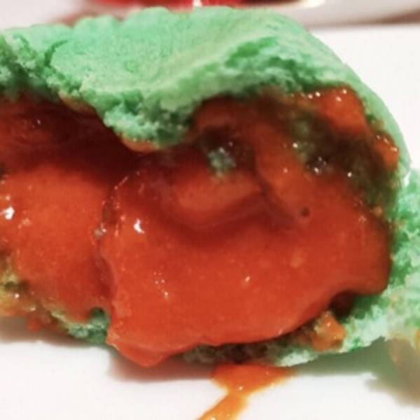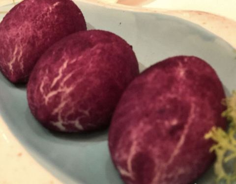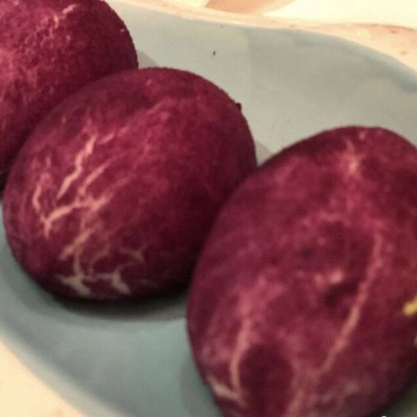 披着紫薯外衣留着奶黄内心的美味。要趁热吃,一口咬下去除了防止烫以外,还要小心爆汁。