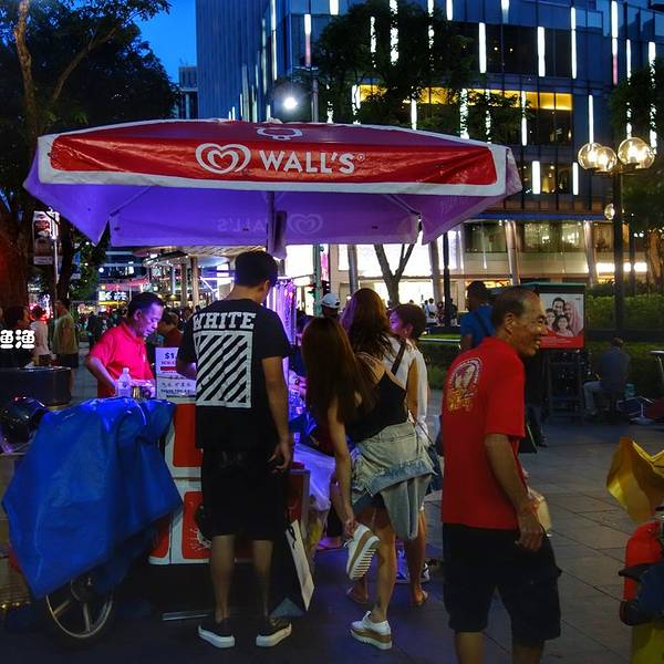 晚餐则选择了的海南鸡饭。食阁其实就是美食广场啦,贩卖来自世界各地的美食。在新加坡食阁很常见,食物经济实惠,十分受当地人的喜爱。游客来这里吃饭,也是个非常接地气的选择。吃完晚饭出来天已黑尽,蓝色调调的ION风景还挺漂亮的。ION的标志雕塑前不少人在拍照留念独特的新加坡街头美食风景。这个老爷爷上过十二道锋味。谢霆锋和桂纶镁就是在他这里买的三明治三色的面包片中间夹着甜蜜爽口的冰激凌方砖。我们买了一个芒果味的,味道赞!