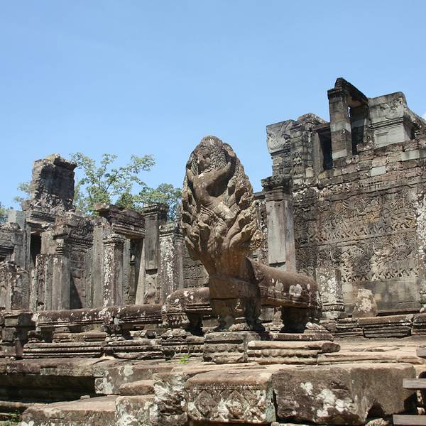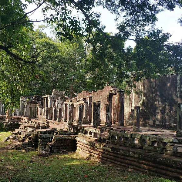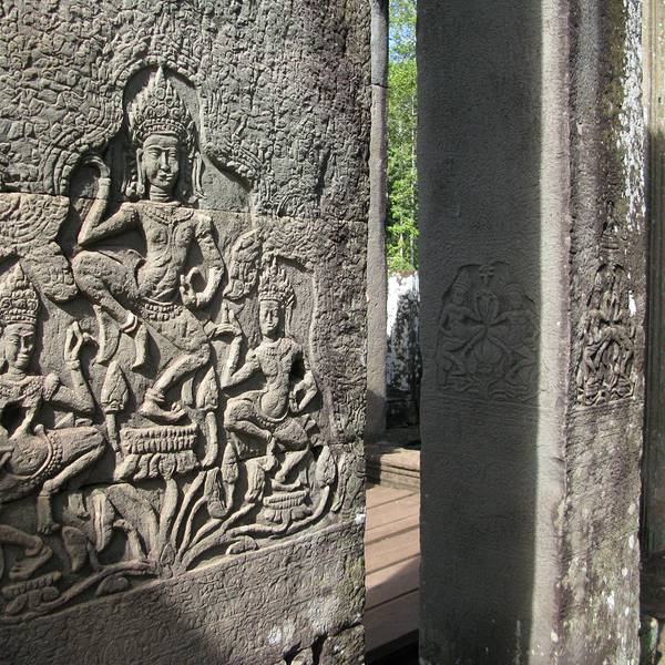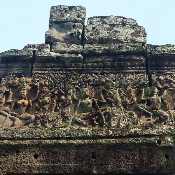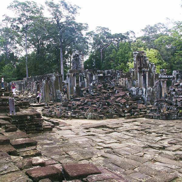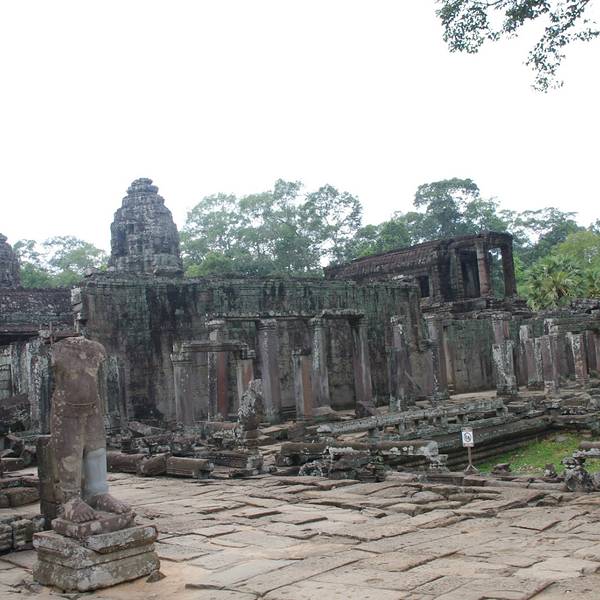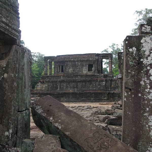 值得一提的是寺庙之墙壁上仍保存着丰富且生动...巴戎寺坐落于吴哥通王城之中心点,其回廊东西长160公尺、南北长140公尺;回廊上方原本皆有木造之屋顶,但由于年代久远,目前只剩下断垣残壁及巨大之石柱供后人凭吊。