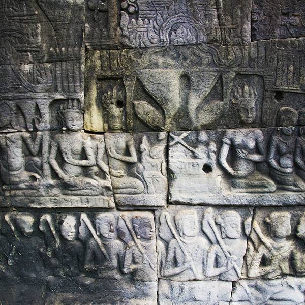 巴戎寺坐落于吴哥通王城之中心点,其回廊东西长160公尺、南北长140公尺;回廊上方原本皆有木造之屋顶,但由于年代久远,目前只剩下断垣残壁及巨大之石柱供后人凭吊。值得一提的是寺庙之墙壁上仍保存着丰富且生动之雕刻,举凡古代战争记述、寻常百姓之生活百态、洞里萨湖之湖畔风光等皆充分透露着当时之情景,绝对是不可不看的珍贵史迹。那一幅幅活灵活现的壁画彷佛诉说着一段段遥远的故事。