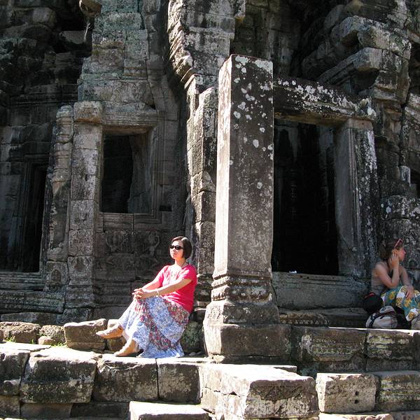 巴戎寺除了那么多微笑脸之外,还有个经典就是两侧墙上的浮雕,都是大片大片的,上面的图画栩栩如生,都讲述了特定的故事,我特意买了本书,去解读上面每一副画的意思,边看书,看研究壁画,是一种享受,站在历史面前,常常象傻瓜一样木然伫立着,一会儿满脑章句,一会儿满脑空白。我站在古人一定站过的那些方位上,用与先辈差不多的黑眼珠打量着很少会有变化的自然景观,静听着与千百年前没有丝毫差异的风声鸟声。
