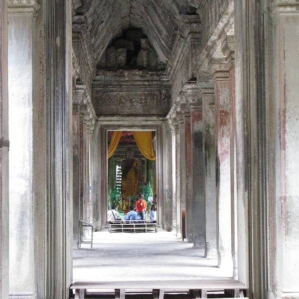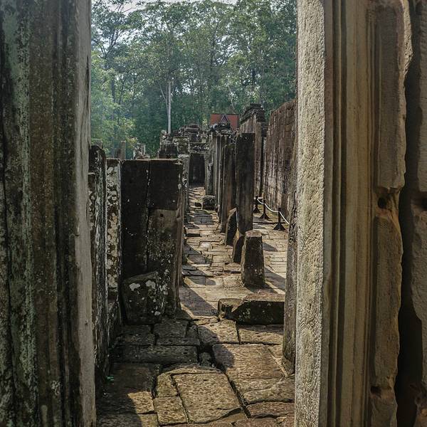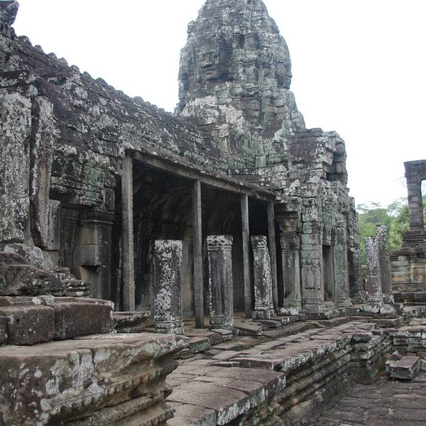 巴戎寺(Bayon)坐落于吴哥通王城之中心点,其回廊东西长160公尺、南北长140公尺;回廊上方原本皆有木造之屋顶,但由于年代久远,目前只剩下断垣残壁及巨大之石柱供后人凭吊。