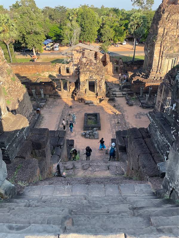 比粒寺位于东梅奔南边约1.5公里处,与它建造于同一时期,也是金字塔式的建筑,但规模要大得多。这里是古代皇族进行火葬仪式“变身为神”的地方,因此也称变身塔。比粒寺建筑很高,爬上去可以眺望远处的森林,视野开阔,是吴哥窟观赏日落的佳地点之一。由于位置略为偏远,到比粒寺看日落的游客没有去巴肯山的多,但如果你冲着日落而来,还是建议在16:30之前到达,可以找到一个好位子。当太阳渐渐沉入原始森林中时,日落的余晖照耀着红砖结构的比粒寺,泛着暖暖的红色,唯美而大气。游玩指南从东边的正门进入比粒寺,就可以看到正对面庙山的三层基座上耸立着一座中央殿堂,四周围绕着四座宝塔。庙山前方的平地上有一个方形石槽,据说是当时火化尸体的地方,两边各有一座藏经阁。在寺庙的东北角有一间小室,是火葬后倾倒骨灰的场所。顺着庙山正面的台阶,一步一步往上爬。台阶非常陡峭,而且磨损严重,攀爬时务必要踩稳,与前后方的游客保持一定距离。庙山顶层的景色非常棒,所处的高度甚至比远方的原始森林还要高,视野,俯瞰下方,有种居高临下的感觉。在等待日落的同时,可以欣赏一下中央殿堂及周围寺塔上的精美浮雕。西南边的那座塔浮雕保存得为完好,可以看到幻化为野猪面容的女神拉克什米,以及拥有四张面容的婆罗摩神之妻莎维德丽。而在东南边塔上则有乘坐着神象的因陀罗神浮雕。这些塔身墙体上有许多整齐排列的小孔,据说曾经填满了宝石。
