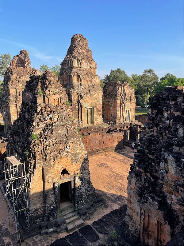 比粒寺位于东梅奔寺(East Mebon)的南侧约1.5公里的地方,也是一座金字塔式建筑,通东梅奔寺建造在同一时期,但规模比其巨大。比粒寺是进行火葬仪式的地方。 比粒寺(PRE RUP)为古代皇族火化变身为神之神殿,又称变身塔。可以看到烧焦过的痕迹,千年前在此举行仪式,定是达官云集,不能随便进入的。