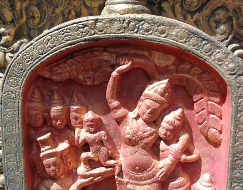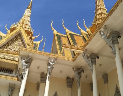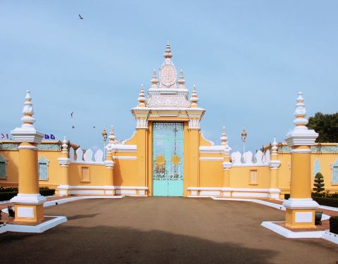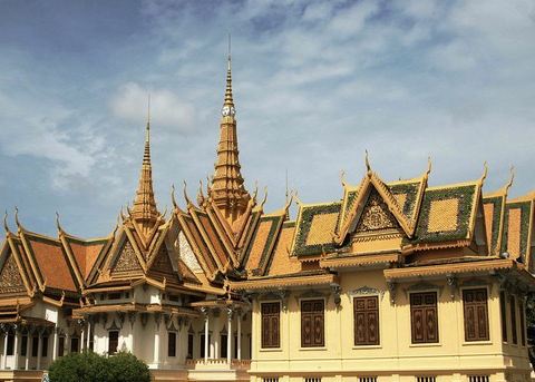 金边王宫也称四臂湾大王宫,因位于湄公河、洞里萨河与巴萨河的交汇处而得名,是诺罗敦国王于1866-1870年建造的,充满高棉传统建筑风格和宗教色彩。 金边王宫是柬埔寨国王的宫殿,由一组金色屋顶、黄墙环绕的建筑组成,造型精美,金碧辉煌。包括查雅殿、金殿、银殿、舞乐殿、宝物殿等20多座大小宫殿,宫殿均有尖塔,代表繁荣;殿身以黄、白两色为主,黄色代表佛教,白色代表婆罗门教。建筑回廊上是仿吴哥寺的华丽浮雕壁画,描绘了历代王朝功绩和宗教故事。 在皇宫的出口处可以看到传统的音乐表演,这些演员大多是因为地雷而失去肢体的残障人士。在皇宫前宽敞干净的草坪上,每到黄昏时分,都会有当地的居民、僧侣,以及来自世界各地的游客到此纳凉,场面非常热闹。需要注意的是,目前金边王宫对公众开放的区域有限,主要是银殿、加冕厅及周围院落。