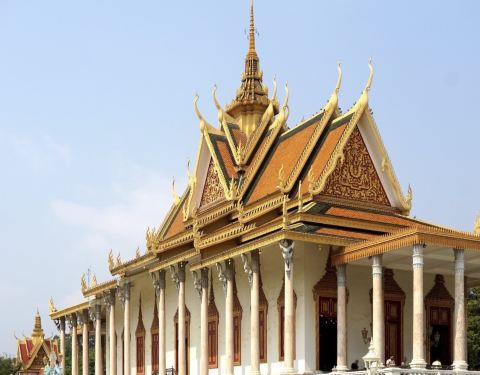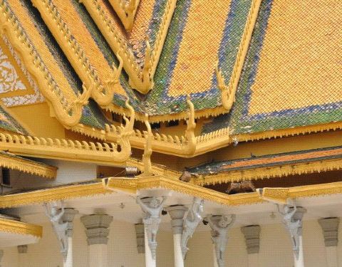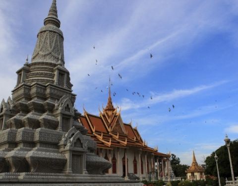 银殿又称银阁寺,位于金边皇宫内,是历代国王礼佛的圣地,因大厅地板镶嵌了5000多块银砖而得名,银片合计共达5吨,富丽堂皇。银殿为木质结构,1962年由西哈努克国王扩建。殿内珍藏着许多珍贵文物,展示了高棉文化的灿烂和丰富。殿内有数百件金银宝物,寺中央就有一座18K金打造的佛像,重达90公斤,佛像上镶嵌了近万颗钻石,为纪念西索瓦国王而打造,相当华丽。此外,这里还珍藏着整块翡翠雕成的玉佛,40多厘米高的镶金壁画,以及陈列着外国国家元首赠送的礼品。即使在红色高棉统治的动荡时期,银殿里的藏品有60%被盗走或破坏,但残存的部分仍旧很壮观。银殿外四面的墙壁上绘有以罗摩衍那故事为内容的壁画,绘制于1900年左右,很有参观价值。外墙周围放置的物品能够充分体现精湛的高棉艺术,其中包括表演古典舞使用的精致面具和几十座纯金佛像,样式精美、巧夺天工。
