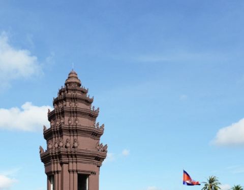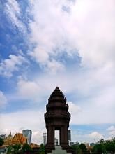 柬埔寨独立纪念碑是为纪念1953年11月9日柬埔寨摆脱法国殖民统治,获得完全独立而建。位于诺罗敦大道和西哈努克大道的交叉处,独立广场的中央。柬埔寨独立纪念碑由柬埔寨著名设计师凡·莫尼旺设计,于1958年3月落成,高37米,共7层,上有七头蛇神(柬埔寨的文化象征)100条,碑身呈五层莲花蓓蕾形,美丽壮观。每年国庆日时,柬埔寨国王或国王代表都会在此举行隆重的庆典,非常有纪念意义。