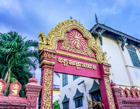 乌那隆寺位于洞里萨河边,国家博物馆出来往北,沿13街继续往北走,到154街右拐(东)就到了。