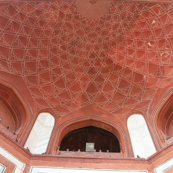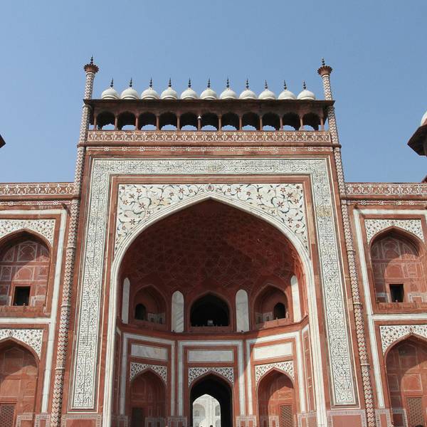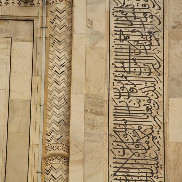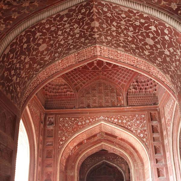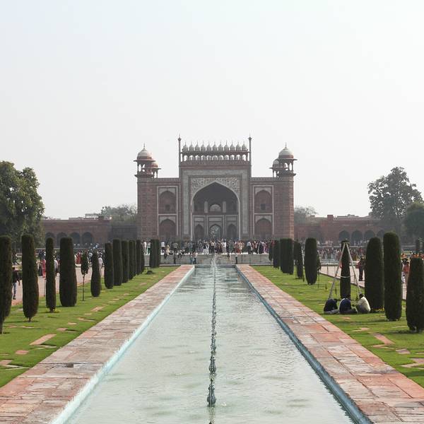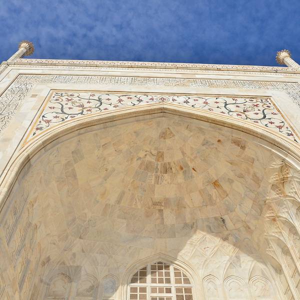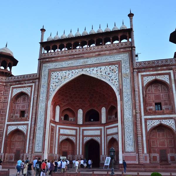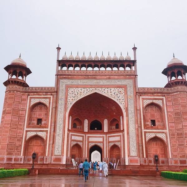 首先看到的是泰姬陵的正门,是红砂岩建筑,装饰着白边和花纹图案,加以大理石镂空的雕饰,正门上前后各有11个小圆顶,每个圆顶象征一年,代表着建筑泰姬陵22年的时间。
