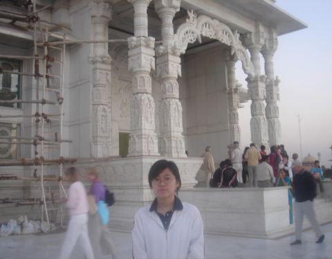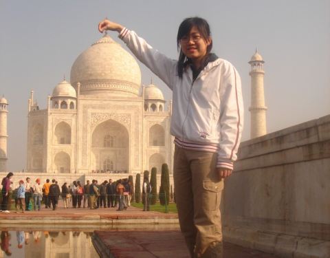 泰姬陵是非常对称的建筑,陵前有一片水池,为了能拍到一张泰姬陵的倒影,我们不到6点就去东门排队,安检过后以百米冲刺的速度奔到水池台前,终于拍到一张泰姬陵的清晰倒影,温婉娉婷。当亲身来到泰姬陵前,那种感觉不言而喻,日出时分,晨雾弥散,点点金光洒在白色的大理石建筑上,呈现出一种暖暖色调,像是当年的泰姬披上了面纱,美得令人心动,不由的相信泰姬,就是这世界上最美的王妃,至少之于沙贾汗的一生,是如此。