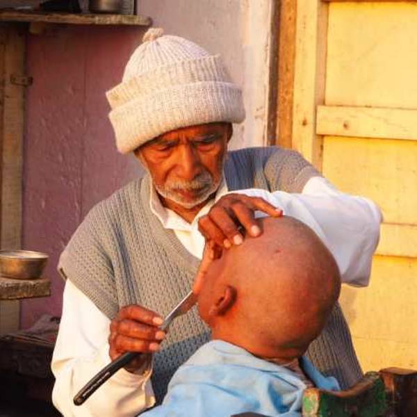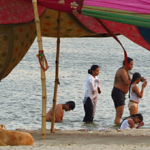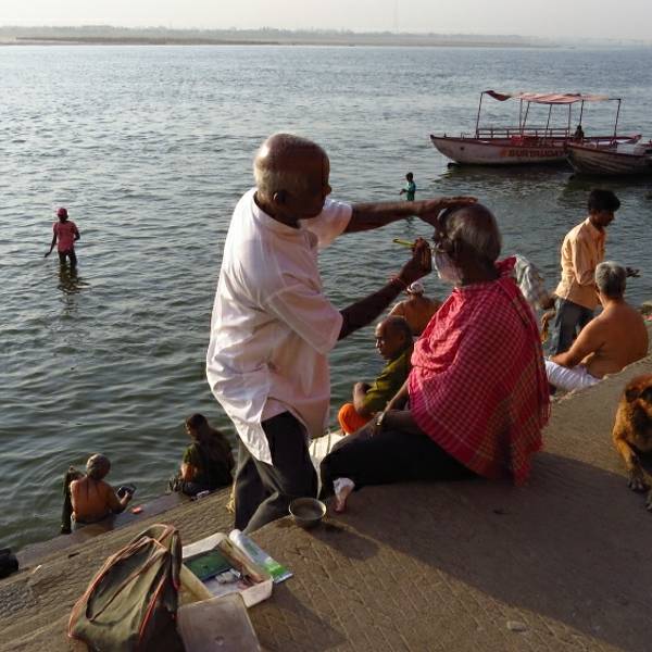 恒河晨浴 体验了夜祭,晨浴也不想错过。 夜色还没有退尽,带着一丝倦意在导游的催促下坐上了拖拖车,沿街的小店还没有开门,屋檐下乞丐紧紧裹着毯子还在睡梦中,路上的行人明显要比晚上少。 瓦拉纳西是当之无愧的圣城。因为在印度,人的一生要做的四件事都能在这里完成。在恒河中沐浴圣水、拜祭瓦拉纳西的湿婆庙、结交圣人、死后归于恒河。 在夜祭台上现在是晨祭,规模不大。周围虔诚的圣徒在理发刮胡,为晨浴作准备;有的面对恒河双手合十,闭眼祈祷;也有小贩在兜售恒河水;更多的当地人步入河中开始圣神的晨浴。 预约好的船在河边等候,晨雾很大,能见度低,坐在船上看不到岸,买了包喂海鸥的食物,一把把撒向空中,成群的海鸥围着我们的船飞舞。弥补了没有看到日出的遗憾。