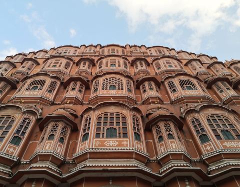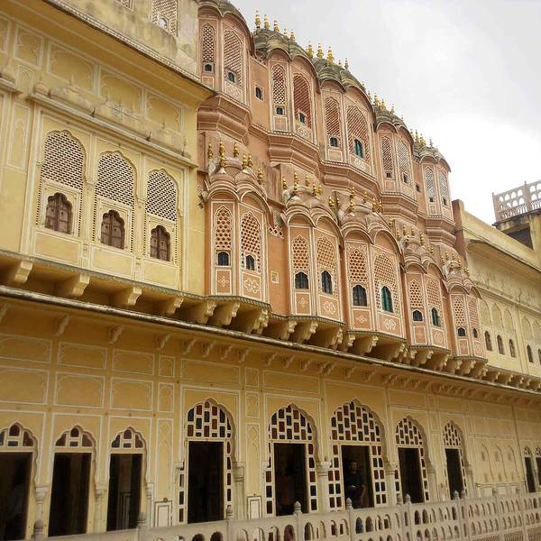 风之宫兴建于1799年,位于斋浦尔商业中心的主干道上,它原本是城市宫殿的一部分,延伸到妃嫔所在的后宫,如今是斋浦尔的一个标志性建筑。 风之宫独特的五层楼外观就像一面巨大的粉红色的“墙”,上面密密麻麻布满了953扇蜂窝状的窗户,用红砂石镂空制成。每到清晨日出时,金色光芒中的风之宫显得特别壮观,而在夜晚明月照耀下又别有一翻韵味。如此设计的初衷是为了既能让妃嫔们观看下面的街道,又不被外面的人看见,因为她们须严格遵守蒙面的规定。这样的结构也使得宫殿内任何地方有风吹入,即便遇到狂风天气,只要把窗户打开,大风就会吹过前后窗,而不会把建筑吹倒,因此得名“风之宫”。 虽然风之宫很出名,但很多游客一般都只在外边看看就匆匆离去。其实内部也有不少值得一看的地方。风之宫的入口在后方,那里还有一处内院。 风之宫内部采光良好,通风顺畅,设计得十分巧妙。这里的回廊四通八达,但通过标示能方便地找到出口。