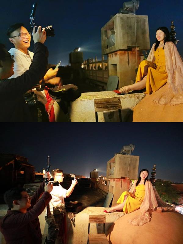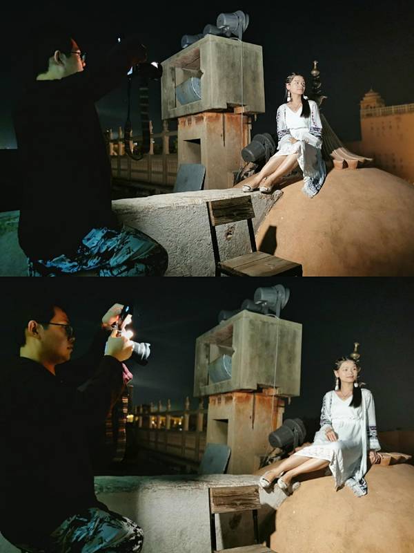 (1)拍摄暮色下的风宫人像,需要配合闪光灯打光,我们就是因为犯懒没有带,还好借到来补救