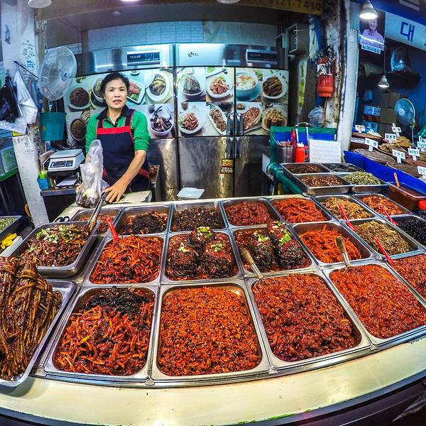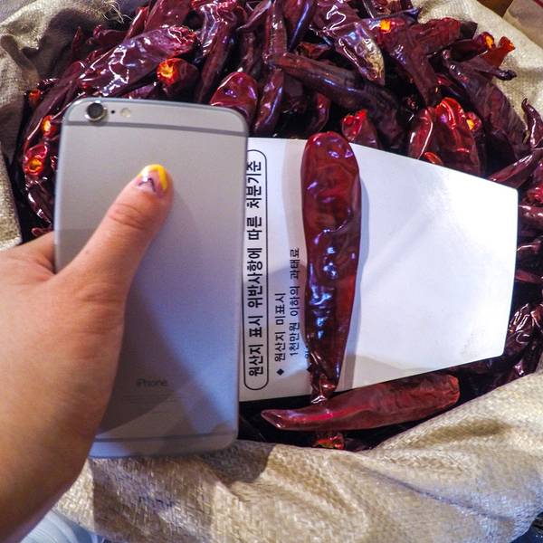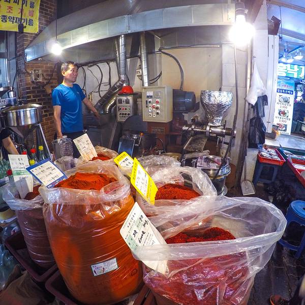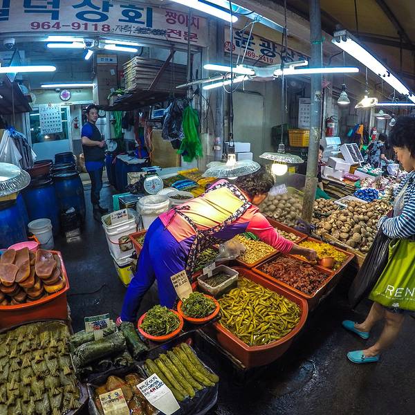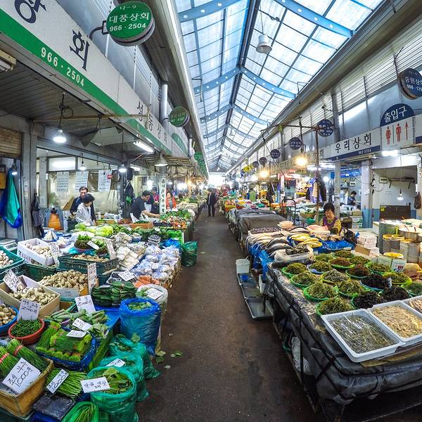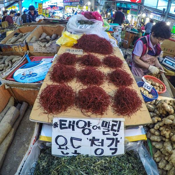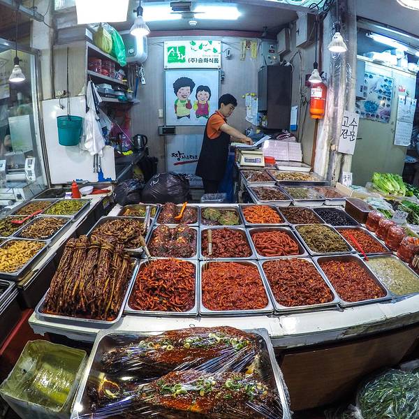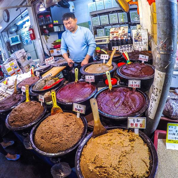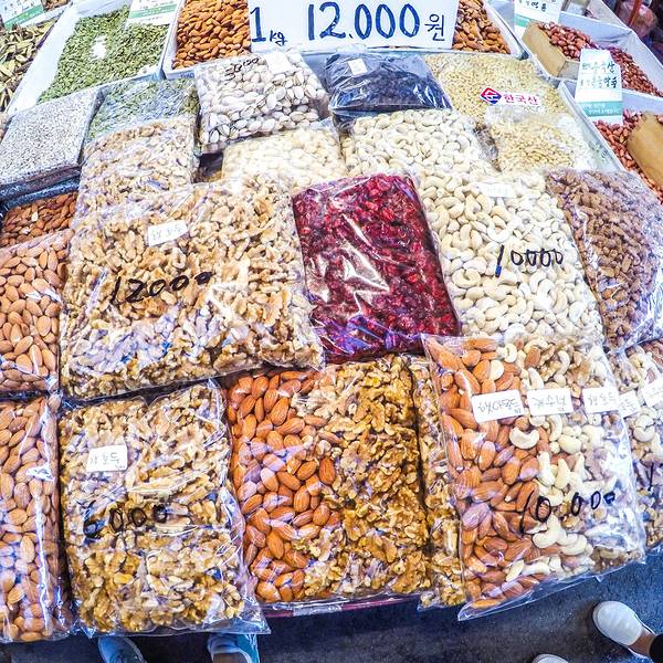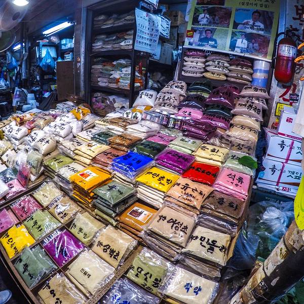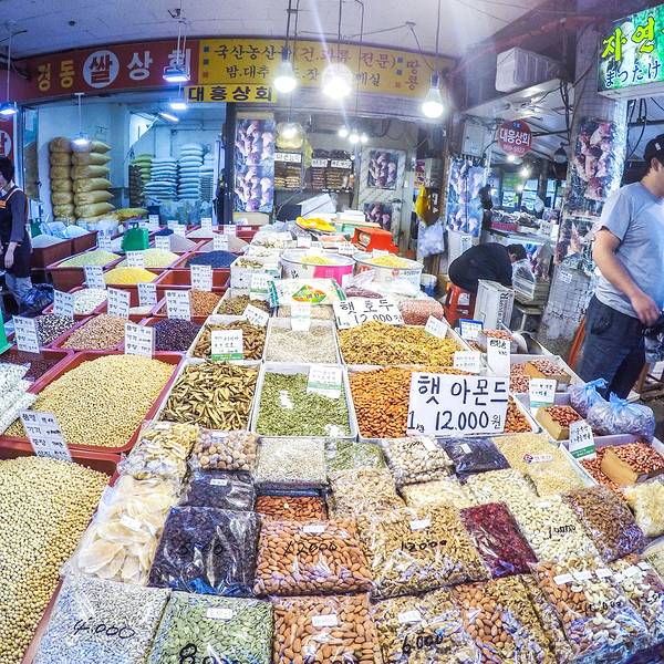 东京市场,等下要做韩餐,老师带我们来买食材 京东市场 俗话说:“京东市场没有的东西,世界上其他地方也没有了”,如果不是不能在这里呆一天,我真的是想买一箱东西回去,坚果真的是超级便宜啊。你看看好便宜!!!大酱,辣椒酱 拥有30年历史的韩国传统酱店,亲手做的土产大酱和大麦辣椒酱,清酱很有名。天然粉末 从衣服染色用的粉末和食物添加色的绿茶粉,百年草粉这里都有,最近韩国年轻人很购买绿豆粉和南瓜粉,还有韩国人很喜欢橡子果粉,它可以做一种口感很想凉粉的食物,非常特别的味道,所以在韩国很受欢迎紫苏叶 相当于成都的香菜葱花鱼腥草吧峰银商会 这条胡同都是买蒜的,蒜街奶奶们普遍都有着30年以上的经验,韩国人饮食对蒜需求非常大,在国内看不到这样的景象香油 排队榨香油的人经常排队,订购5瓶以上可以现场榨~老板娘炫耀她的猫猫五味吃饭 好喜欢这里 刚刚去了传统市场,真的想在里面玩一天,好棒啊,最好早上去,会让你照相,在10点最好到,超大厨来了,快来表扬我 海鲜韭菜煎饼,做它的时候有下雨的声音,太浪漫了好吗!!