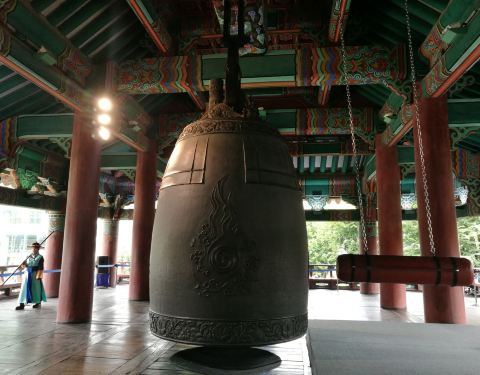 这是一座钟楼,除周一外,每天中午十二点都会敲钟。市人可以申请参加。据说敲钟会带来幸运。 韩国人特别喜欢仪式,所以十二敲钟,仪式从十一点就开始了。有兴趣的可以去看看。