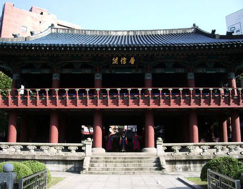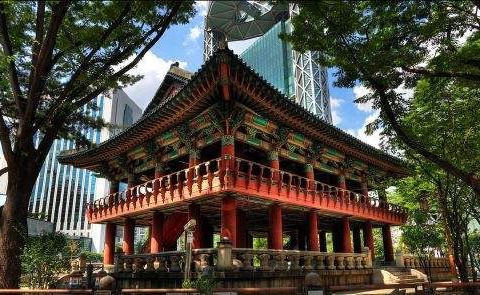 普信阁是一个木制的两层阁楼,里有一个巨大的铜钟,每年新年的时候都会敲响,位于首尔市中心的古老建筑之一,平时寺庙基本都是关闭的,后面有一条受欢迎的美食街。