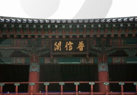 普信阁是一个木制的两层阁楼,里有一个巨大的铜钟,每年新年的时候都会敲响,位于首尔市中心的古老建筑之一