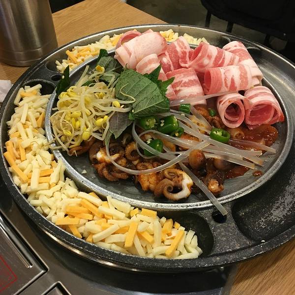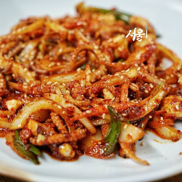 其实就是牛骨汤,味道清淡,鲜味十足。感觉在寒冷的天气喝这个,会特别舒服。四年前在 首尔 吃过一次辣炒鱿鱼,意犹未尽,从此解锁了我对鱿鱼的喜爱。