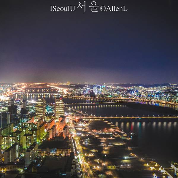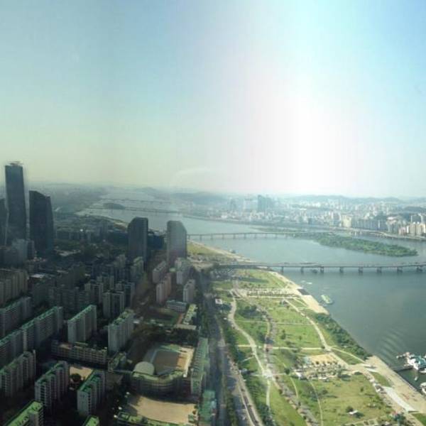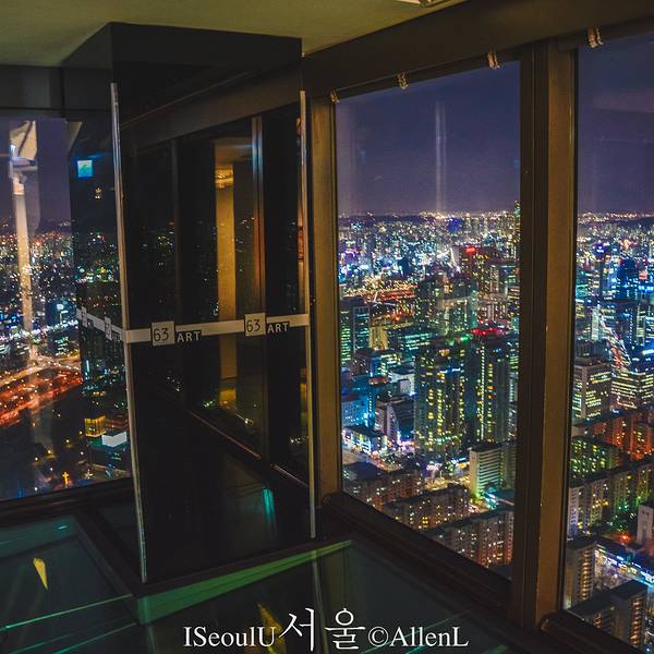 购票后在引导员带领下,乘坐电梯去观景台,1分半即可到达顶层。上来之后,视野的确不错,以汝矣岛为中心的首尔风光尽收眼底,但遗憾的是,这里有着跟首尔塔一样的通病,玻璃窗后面的灯光太强。