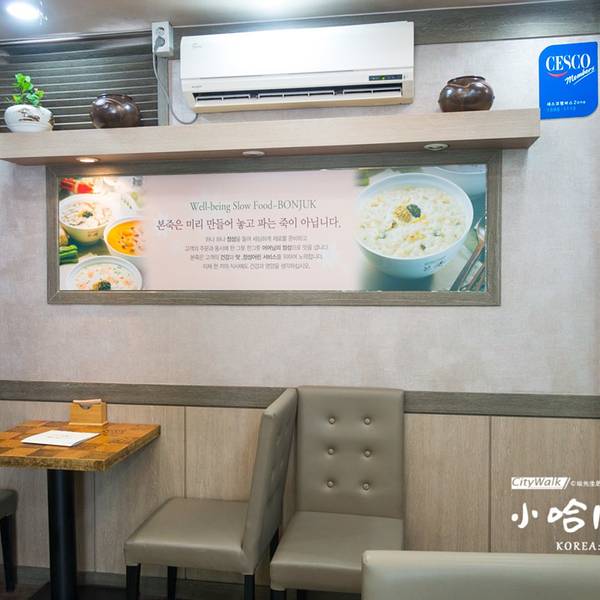 本粥创造了特色慢食这样的新造语,开设了1000多个加盟店,是拥有很高人气的连锁店。本店运用严格的精选标准,可以卫生简单的食用。食用很久以后也会感觉肚子很饱,是世界各国旅客乐于寻找的地方。特别是,在本粥你可以食用到包括南瓜粥、红豆粥等传统粥在内的参鸡粥、鲍鱼粥等营养粥,而且还有蟹肉奶酪粥、章鱼泡菜粥、混合粥等用对身体很好的原料做成的美味粥。