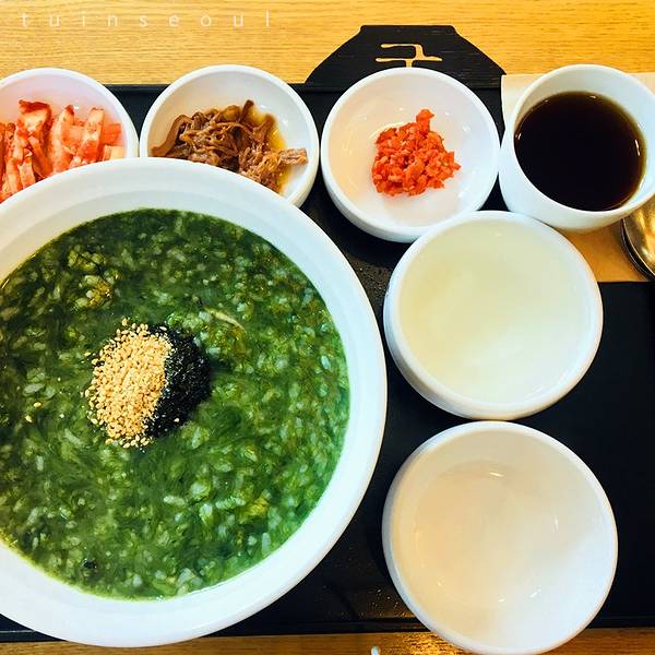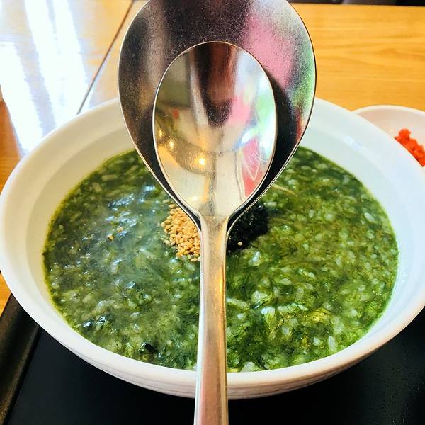 清潭洞JYP旧公司附近 主营各种类型的粥,连锁店,有中文菜单。 我点的是生蚝粥,端上来是一碗绿油油的不明物体。与众不同的外观下,是绵软细腻的口感,入口即化超满足。生蚝藏在看不见的地方,数量不在少。这是一碗量大味美的粥,加上凉拌牛肉丝和酸梅茶,强推! HOW MUCH:9000韩元本粥清潭店一把尺寸惊人的大钢勺本粥清潭店在粥店里,看下午两点的 首尔 街头本粥清潭店