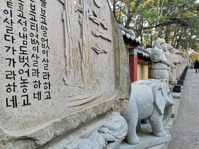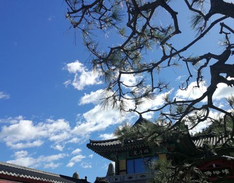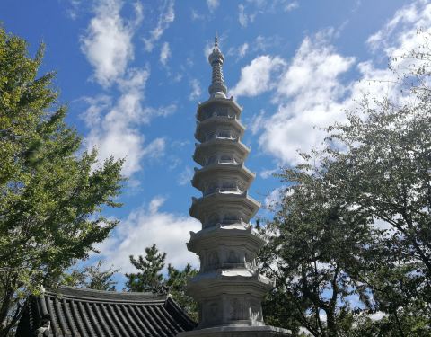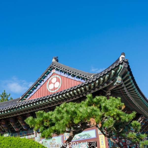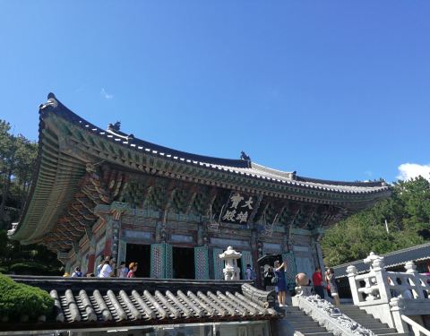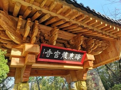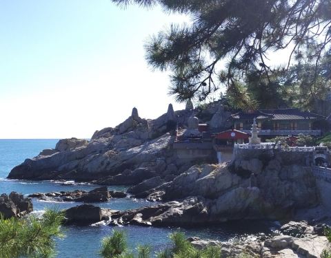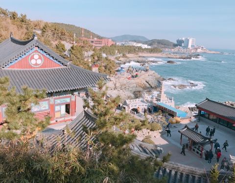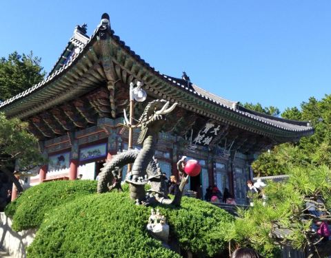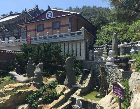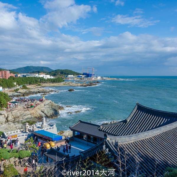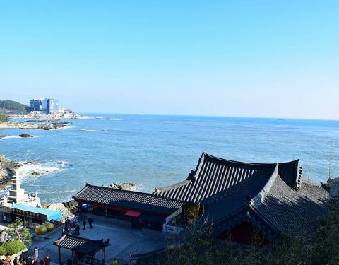 海东龙宫寺位于釜山东海岸,是韩国一座位于海边的寺庙,周边景色非常优美。龙宫寺由曾经做过恭民王的王师的懒翁于1376年创建,该寺庙依山傍海,景色秀丽。内有海水观音、大雄殿、龙王堂、窟法堂、四狮子三层石塔等景观。大雄殿重建于1970年,建筑表层涂有丹青,多年来见证了历史的风风雨雨。大雄殿右侧石窟内是样式奇特的窟法堂,正面则是四狮子三层石塔。石塔的每一层都有4个分别代表喜怒哀乐的狮子,因此被称为“四狮子”。龙宫寺较特别的景致当属108阶和日出岩。从龙宫寺入口需要下108阶才能来到寺庙,而日出岩就位于108阶中间。站在岩石上可以聆听到海浪拍打岩壁的声音,欣赏日出的壮观美景。每当新年,不少人都来到这里面对日出许下心愿。而农历4月时,龙宫寺入口樱花繁盛。到了释迦摩尼诞辰,寺庙被电灯装扮起来,呈现出幻想般美丽的夜景。