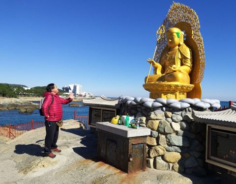 海东龙宫寺是韩国唯一一座建在海边的寺庙,与其名称非常相称海滩附近有一条海鲜街,走到尽头可以搭乘100路车到海东龙宫寺,大约三四十分钟。海东龙宫寺是韩国唯一一座建在海边的寺庙,与其名称非常相称。