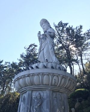 海东龙宫寺外边有一个巨大的停车场,许多大巴车都停在这里,旅游团很多,平时也有很多韩国人来这里拜佛祈福。寺庙的面积并不是太大,可以看得出来寺庙非常古朴,从大门入口处沿着台阶一路下山,走了一百多个台阶到了海边,就是寺庙了。最大的特色就是寺庙的大殿面朝大海,海面上波澜起伏,寺内平静如常,这些寺庙的大殿跟中国国内的寺庙造型差不多,也是供奉着各种佛像,沿着台阶上到稍微高一点的观景台上,那里有一尊观音菩萨像,朝向大海,这里也是最佳的观景平台。海边被围了起来不能下去,不过海水还是很干净的。 展开