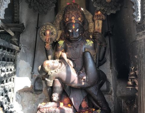 这里是国王曾经居住过的老王宫,最初建造于李查维王朝时代,如今看到的建筑...哈努曼是印度教中的猴神,Dhoka是大门的意思,因此哈努曼多卡意为“猴神门”,门前左侧石墩上竖立着猴神身披红色斗蓬,立于小伞之下。