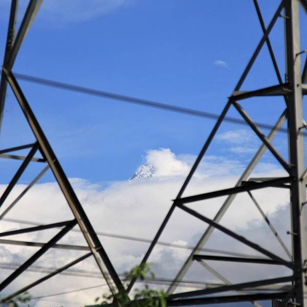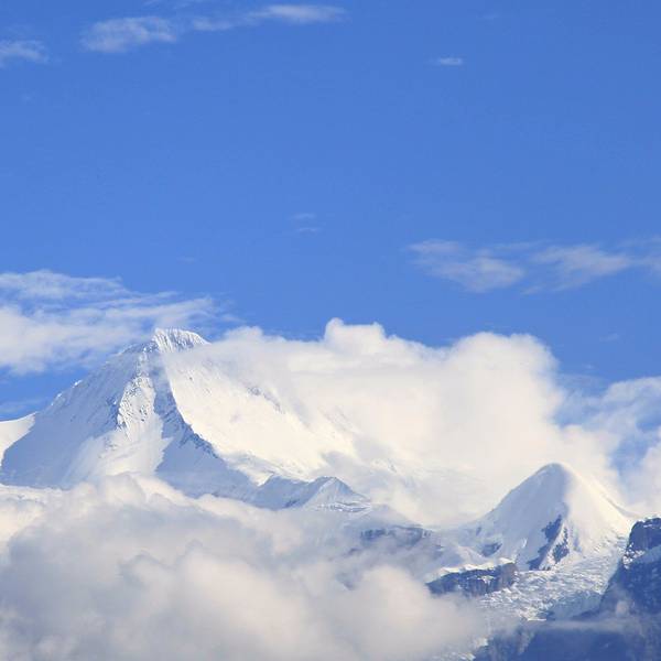 不知是谁,突然说了一句“快看,雪山”,全车的人都向窗外望去。在远方,雪山静静的隐藏在白色云层之后。在大家的强烈要求下,司机停下了前行的汽车,给了大家下车观看的时间。雪山再次露出了它的全貌,这一刻,仿佛在与我们送别,互诉不舍。执念