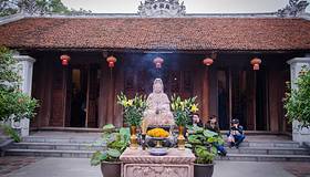 建于1803年,寺中保存有153尊手工精美的雕像,里面有一顶珍贵华丽的轿子,是阮朝皇室赠送给创建高僧觉圆的。
