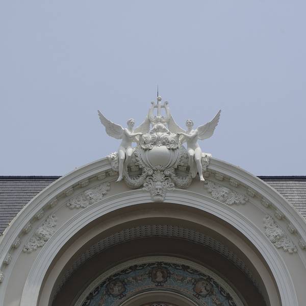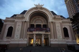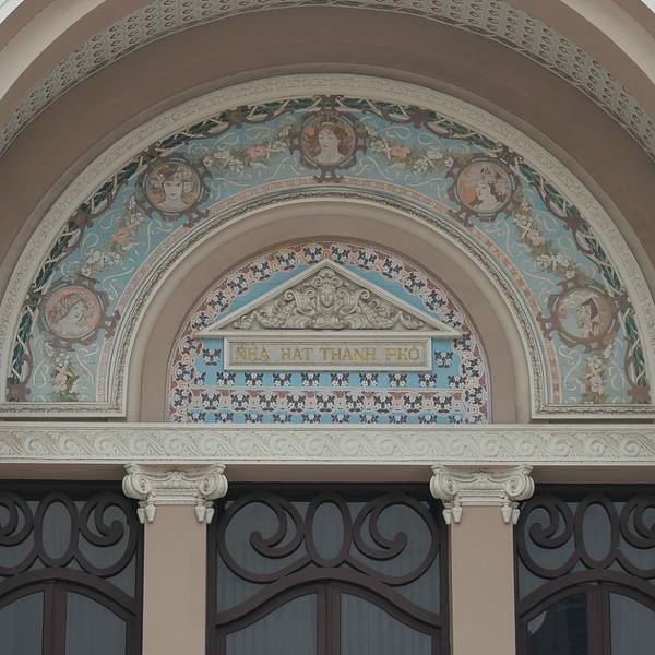 胡志明市立歌剧院,也称西贡剧院,同样受到法国殖民的影响,带着西方的文化烙印,外观呈现出典型的哥特式建筑风格。歌剧院外墙雕刻有许多精美浮雕和花纹,美轮美奂。正面看,巨型的拱门顶端则是两位女天使手扶圣琴的姿态,而拱门下方的两个立柱则是两位女神托起大门的形态,西方神话色彩浓厚。