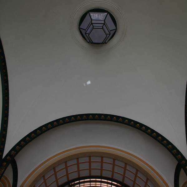穹顶有许多辐射状的梁柱,漆成悦目的青绿和褚红色,绿色那些是用来隐藏排水管的。