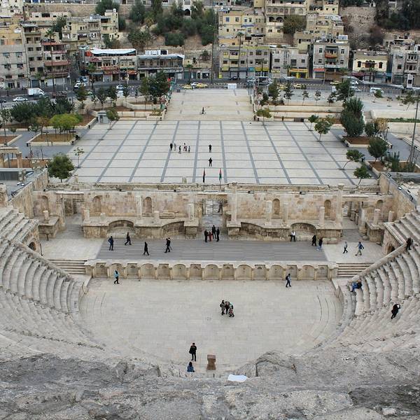 【环境】安曼老城中心,从城堡山上俯视,很容易看见【环境】安曼老城中心,从城堡山上俯视,很容易看见。门口一个广场,更像是市民广场,随意休息,小朋友在乱跑。 【布局】入口在舞台侧面,分后台、博物馆、舞台、观众席等几部分。罗马剧院高124米, 舞台下方有15...【环境】安曼老城中心,从城堡山上俯视,很容易看见。门口一个广场,更像是市民广场,随意休息,小朋友在乱跑。 【布局】入口在舞台侧面,分后台、博物馆、舞台、观众席等几部分。罗马剧院高124米, 舞台下方有15个“凹槽”,是它的回声系统, 第一层和第二层中间有四个门,是观众入口,观众席中间最后面有个庙,一个拱形和两个半圆顶的门,这个庙是献给太阳之子的。 展开