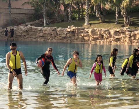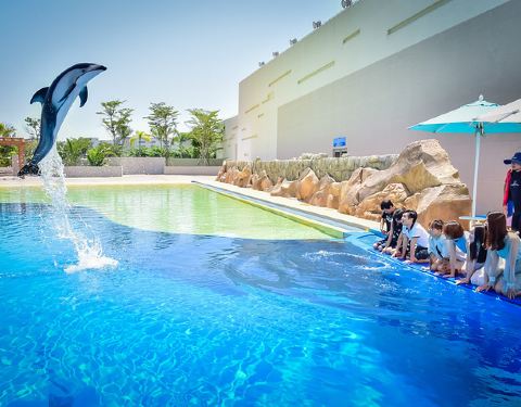棕榈岛亚特兰蒂斯酒店内的迪拜亚特兰蒂斯海豚湾有各种与海豚亲密接触的游戏,可以和海豚一起唱歌、一起跳舞、一起游泳、一起戏水,当然还可以亲密拥抱,海豚甚至还会给你一个亲吻。 这里占地约4.5公顷,这里模拟海豚生活的自然环境,为海豚打造真实舒适的家园。它分为三处超大的环礁湖,共饲养着二十多条所罗门群岛进口的瓶鼻海豚。这里有个浅滩,是专门给那些不会游泳和小孩子们下水的地方。在浅滩上他们也可以和海豚亲密接触,这样的设计非常的人性化。参观导览所有的游客都需要按照规定的时间进入景点,进入后首先会被工作人员先安排在一个房间里看介绍海豚的录像,然后有训练人员讲解提问,告诉你如何抚摸海豚,以及安全的站姿和手势都是非常有讲究的。后现场分组,发放泳衣。待换好景点提供的泳衣后,你会迫不及待的想冲到水里快点与海豚来场亲密接触。 与海豚亲密接触前会让游客分好组跟着训练人员下海,站成一排。海水很浅,齐腰深,不一会儿,一头海豚就游了过来,你可以双手抚摸它的背脊,它的背脊滑溜溜的。海豚一上来就来了一个飞跃,与大家一起来张合影。之后会来亲亲游客,单个和游客拥抱、合影,还可以亲亲。如果你会游泳,还可以与海豚一起游到环礁湖中央并潜入池底,然后体验受欢迎的项目——让海豚载着你一路畅游,后将你护送至岸边。海豚和大家合影完毕后,所有人面对面的站成两排,训练人员站在两队前方,指引着海豚游到大家的面前,开始一起唱歌。一曲完毕,训练人员拿出一条小鱼奖励给海豚。好时光总是非常的短暂,到了离别的时候,在临别之时,海豚绝技连发,站立、倒走、高空飞跃。后和大家依依惜别,海豚便游走了。