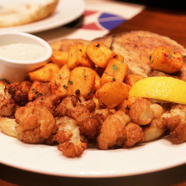 中东菜除了胡姆斯以外,剩下一大特色就是类似于烤羊肉串了,英语里应该叫做Kabab。Kabab的肉质里分为两种:一种是纯肉,将肉切成大块状cube呈上,也叫grilled meat,另一种是肉馅混合的,也称minced meat。个人比较喜欢吃大块肉的肉质口感,不太喜欢细软的那种肉馅混合。所以我们点了一个牛肉的grilled meat,40AED,如上图~~外加一份羊排Lamb Chops,54AED,如下图~~点下边这道菜纯属为了安慰自己,不要吃太荤。。正巧看到评论里有人推荐这道菜,名字叫Mixed Fried Vegetables,20AED。主食不免俗的选了网红款羊肉饭~~Stuffed Lamb。