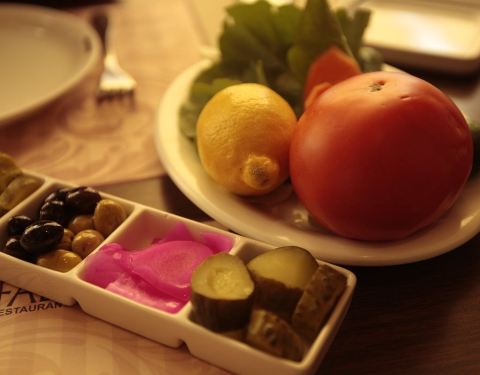 餐厅分室内和室外,这个天气坐在室外刚好,我们就是坐在室外的,不冷不热。服务员服务非常热情,有一位服务员一直巡视是否需要添加面包。这是一家人气黎巴嫩餐厅,有品种丰富的海鲜烧烤,每一道菜味道都很棒!